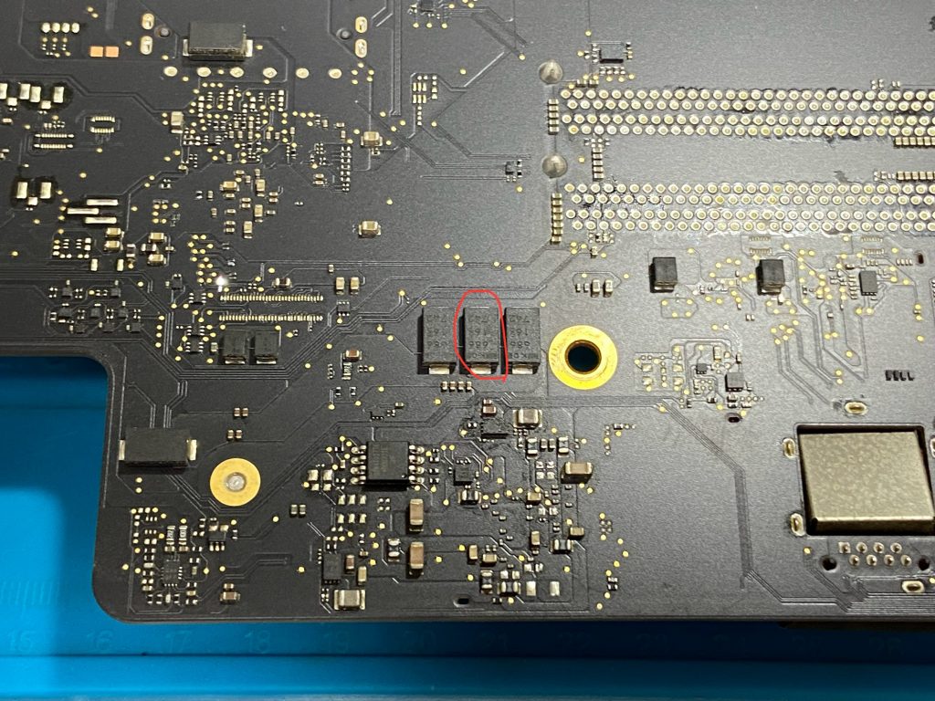 ロジックボードを更に調査し、ロジックボード上に無数にあるコンデンサのうち、1つのタンタルコンデンサの故障を検出しました。
