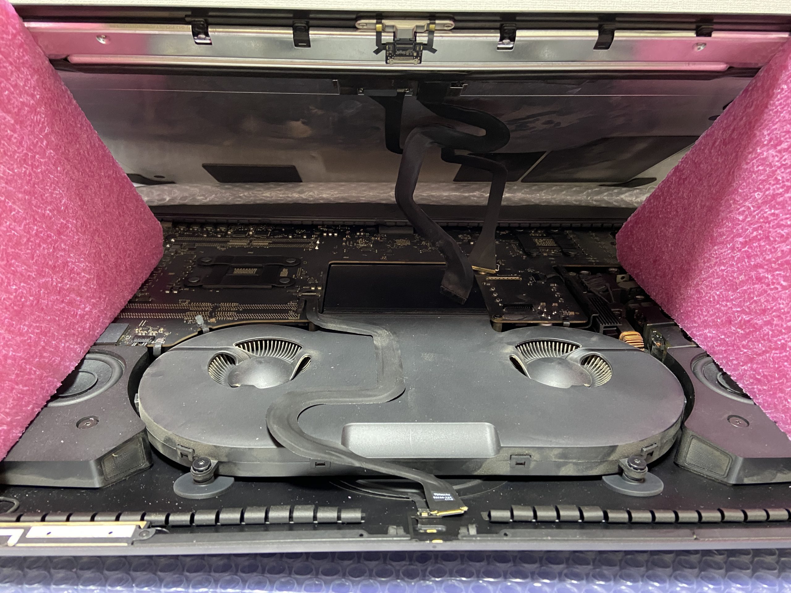 iMacProも同様に液晶ディスプレイが最も重いパーツとなりますが、iMacProに限ってはロジックボードと接続するケーブルが実にタイトな長さになっています。